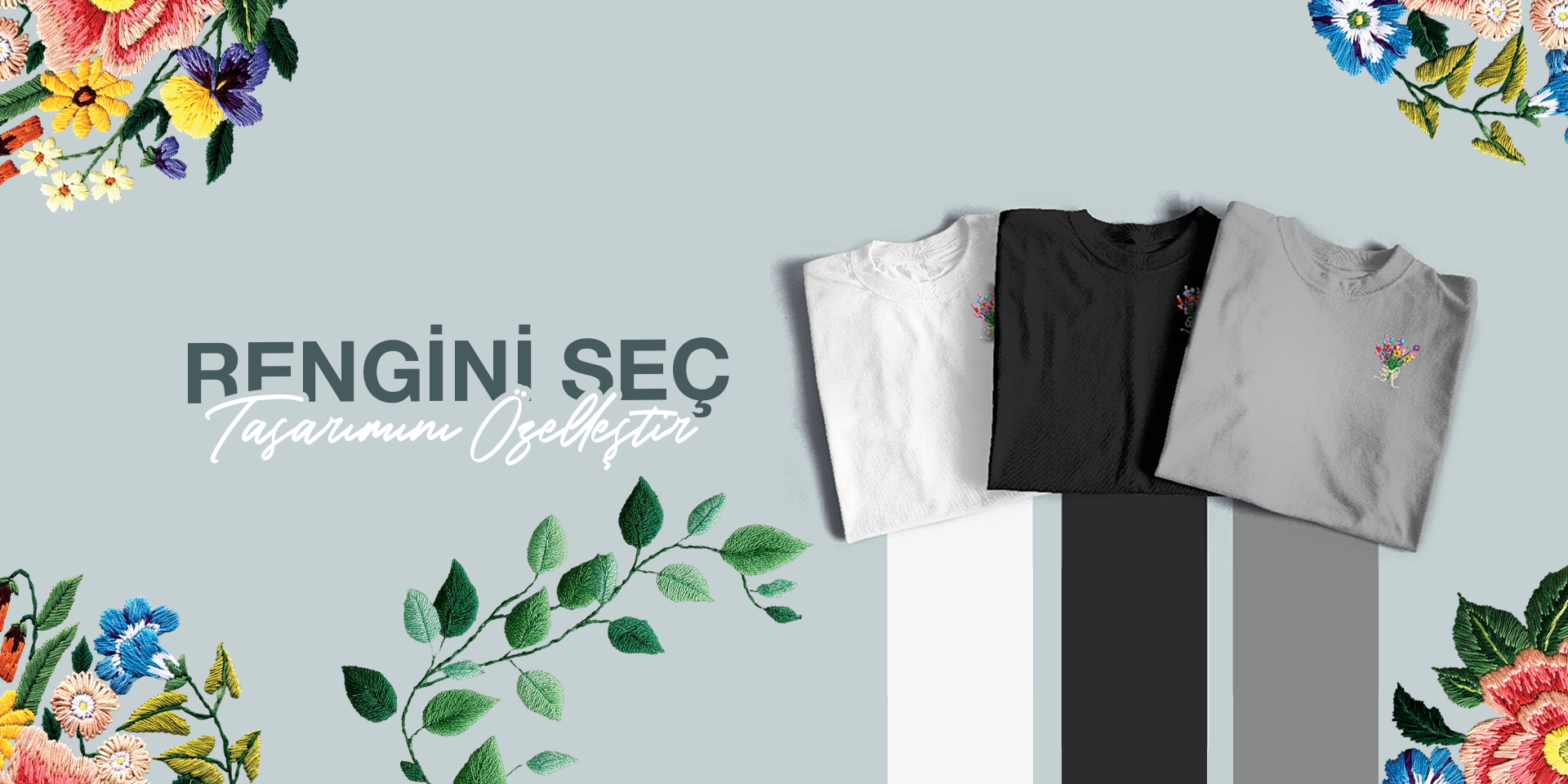 Sizin için seçmiş olduğumuz ürünler arasından seçiminizi yapın, renk-beden gibi seçenekleri belirleyin tasarım unsurlarınızı seçip nakış sürecini 3 adımda tamamlayın.