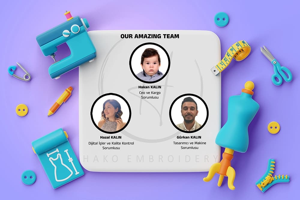 Hako Nakış Ocak 2024’te kurulmuş gerçek bir aile firmasıdır. Mühendislik ve öğretmenlik kariyerlerimizi geride bırakıp, oğlumuz Hakan’ın doğumuyla ilham aldığımız bu renkli serüvene adım attık.